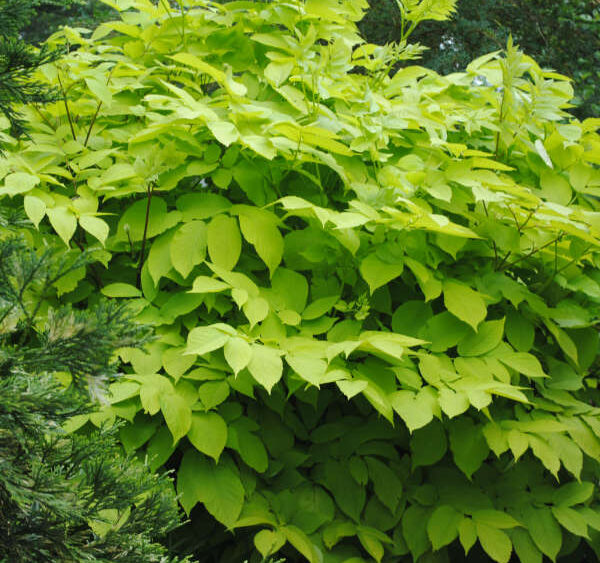 Aralia ‘Sun King’ is a unique tropical looking perennial with large leaves that measure up to 3 feet long. Its bright golden leaves give nice contrast to its reddish stems. If given a few hours of sunlight a day the foliage remains bright yellow all summer long. If grown in a shadier location the foliage will be an intense lime green. In late summer tiny white flowers form with deep purplish black inedible berries. Like most Aralias, the flowers attract many pollinators.