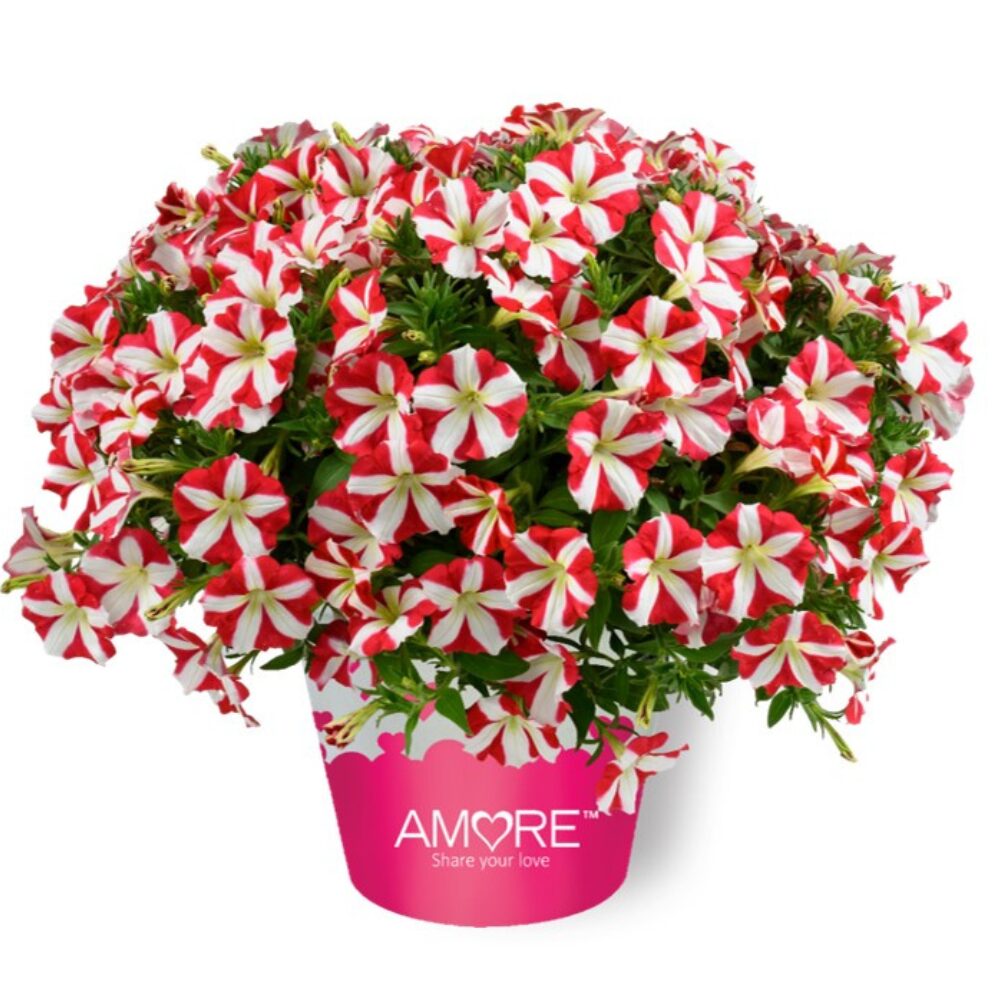 The “Amore” series of petunias, known for their distinct heart-shaped pattern on every bloom, offers early flowering and a mounded growth habit. This semi trailing petunia series are well-suited for containers, hanging baskets, and window boxes. The series includes various colours, such as “Queen of Hearts” (magenta hearts on a yellow backdrop), and ‘King of Hearts’ (regal-red hearts highlighted in bright white blooms).